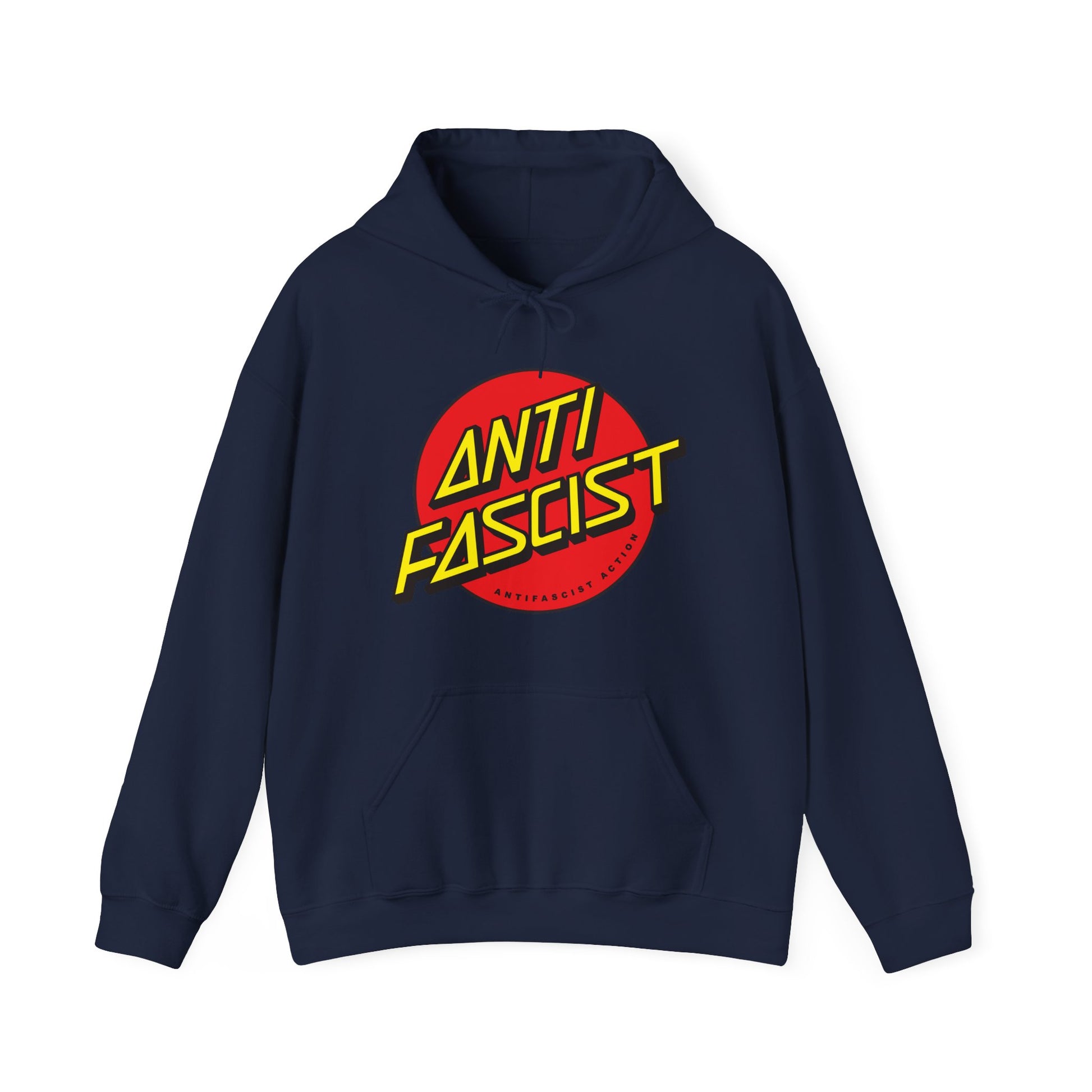 This hoodie features a fake logo for Antifascist Action resembling a vintage american skateboard logo. Stand up for justice in style. This bold hoodie remixes classic American sports and skateboard logo aesthetics with a clever twist — a parody Antifascist Action emblem designed in vintage Americana typography with a retro swoosh flair. Perfect for protest lines, rallies, or simply making your stance loud and clear in everyday life. Whether you’re marching against Trump-era politics, fighting rising authoritarianism, or just love rebellious streetwear with a purpose, this hoodie delivers comfort, warmth, and resistance in one package.